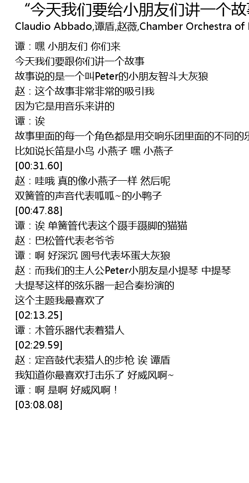 | [00:17.43] | 谭:诶 故事里面的每一个角色都是用交响乐团里面的不同的乐器来扮演的哦 |