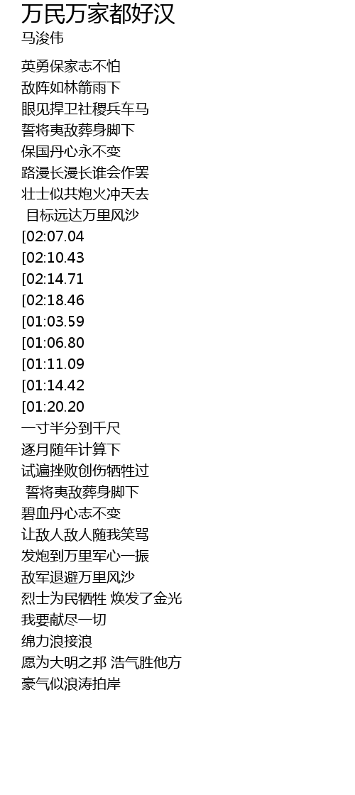 | [03:02.69][01:11.09] | 万民万家个个好汉 |