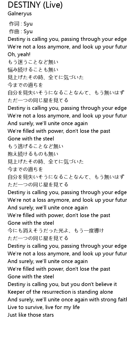 | [03:13.500] | Destiny is calling you, passing through your edge of heart |