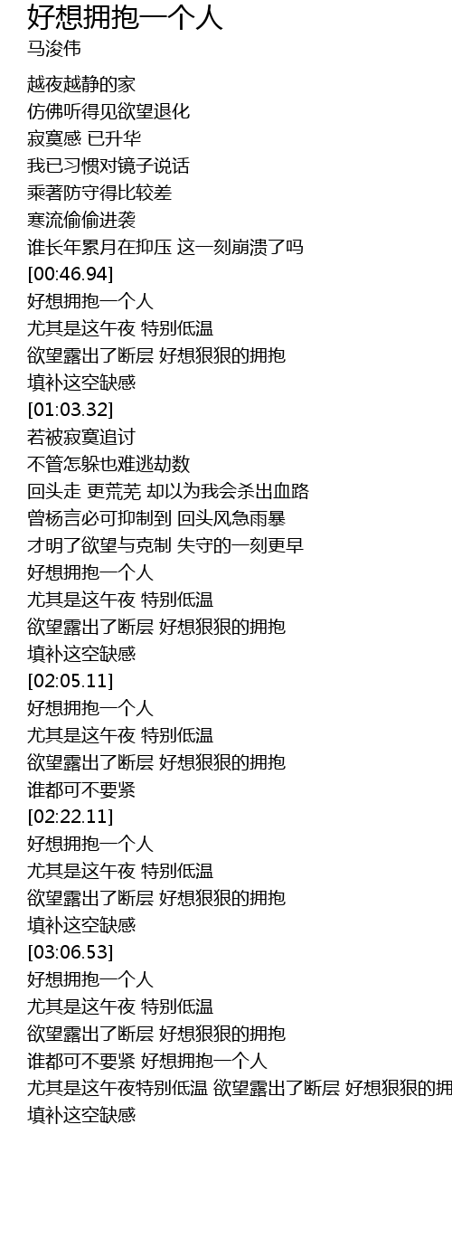 | [03:20.75] | 谁都可不要紧 好想拥抱一个人 尤其是这午夜特别低温 欲望露出了断层 好想狠狠的拥抱 填补这空缺感 |