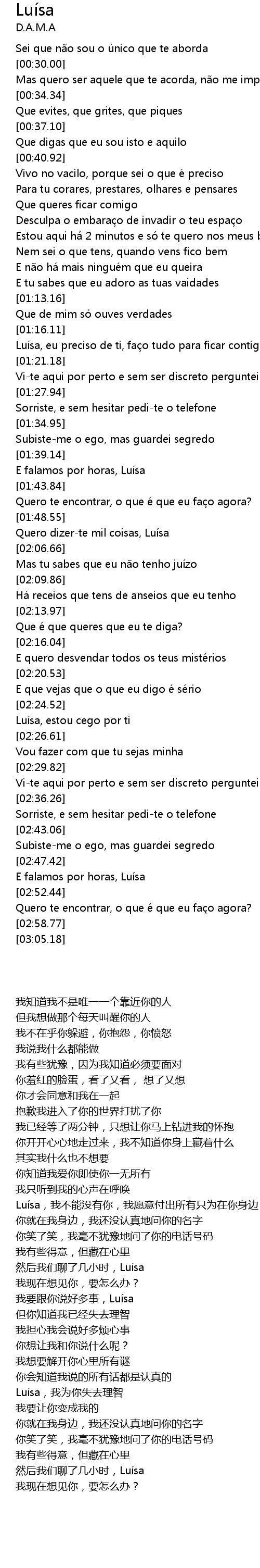 | [01:16.33] | Luísa, eu preciso de ti, faço tudo para ficar contigo |