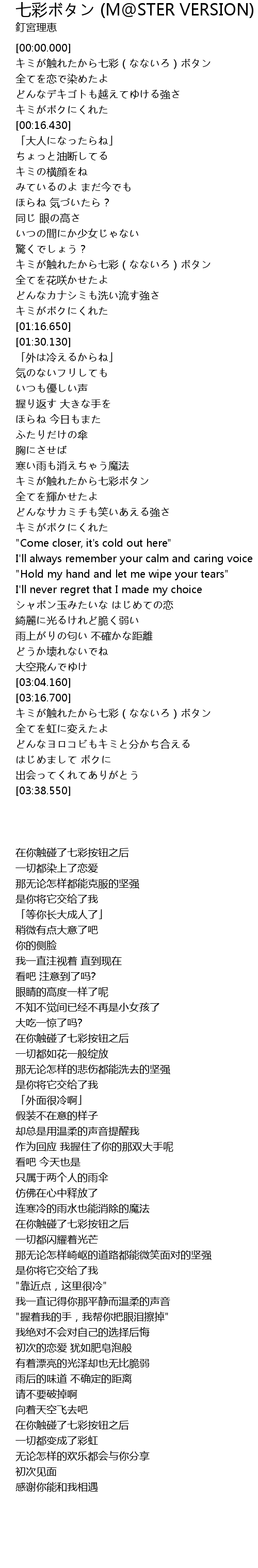 | [03:18.700] | キミが触れたから七彩(なないろ)ボタン |