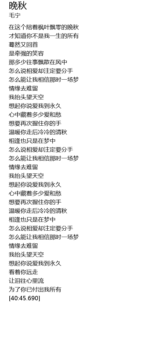 | [00:26.600] | 在这个陪着枫叶飘零的晚秋 |