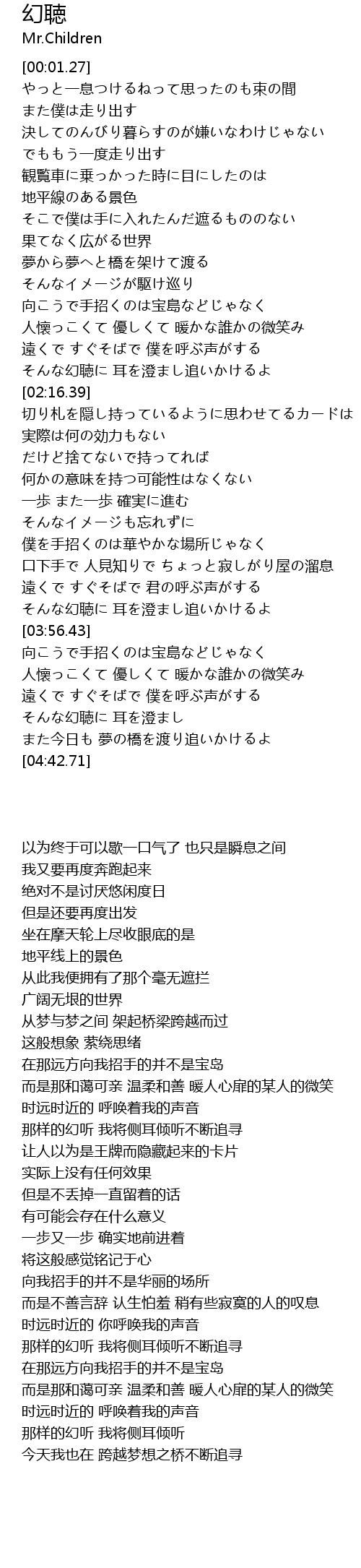 | [02:06.50] | そんな幻聴に 耳を澄まし追いかけるよ |