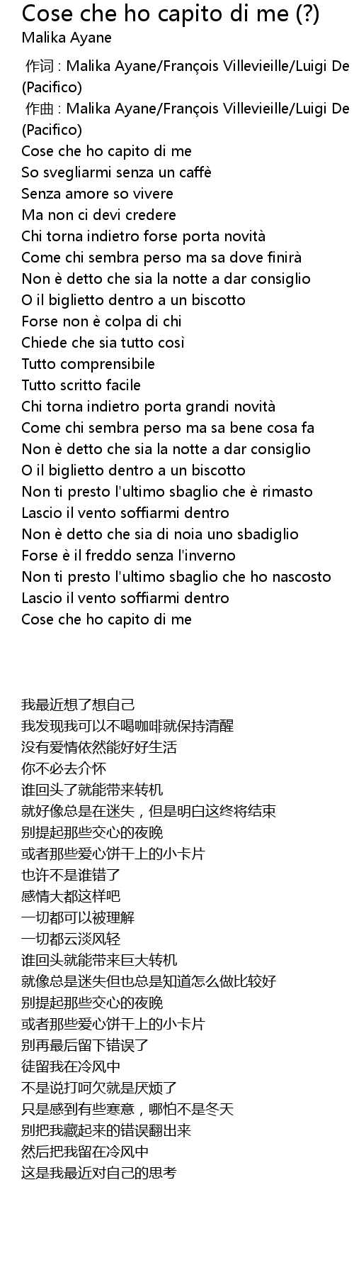 | [00:01.000] | zuò qǔ : Malika Ayane Fran ois Villevieille Luigi De Crescenzo Pacifico |