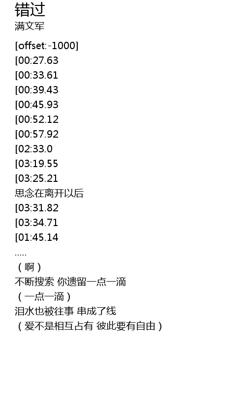 | [03:49.38][03:25.21][02:45.12][01:15.64] | 爱总是错过才懂 思念在离开以后 |