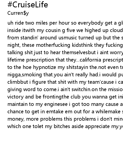 | uh ride two miles per hour so everybody get a glimpse of the real niggawho inside itwith my cousin g five we highed up cloudedbitches gettin stoned just from standin' around usmusic turned up but the smoke way loudermust be amateur night, these motherfucking kidsthink they fucking with usthey fucking stupidthey talking shit just to hear themselvesbut i aint worry bout themi got that lifetime prescription that they...california prescription sound of exoticridin to the hoe hypnotize my shitstayin the.not even tryin bitchesnot even lying nigga,smoking that.you ain't really had.i would put you dime if it was such a climbbut i figure that shit with my team'cause i came in here with em.thanks giving word to come.i ain't switchin.on the missionand defy.drivin a.this the victory and be frontingthe club you wanna get ini ain't even attending this maintain to my enginesee i got too many cause and if you .before i must get the chance to get in emtake em out for a whilemake sure that they're doing finemore money, more problems this problems i don't mindstanding outside tryin to pick which one tolet my bitches aside appreciate my.you never know homie. |