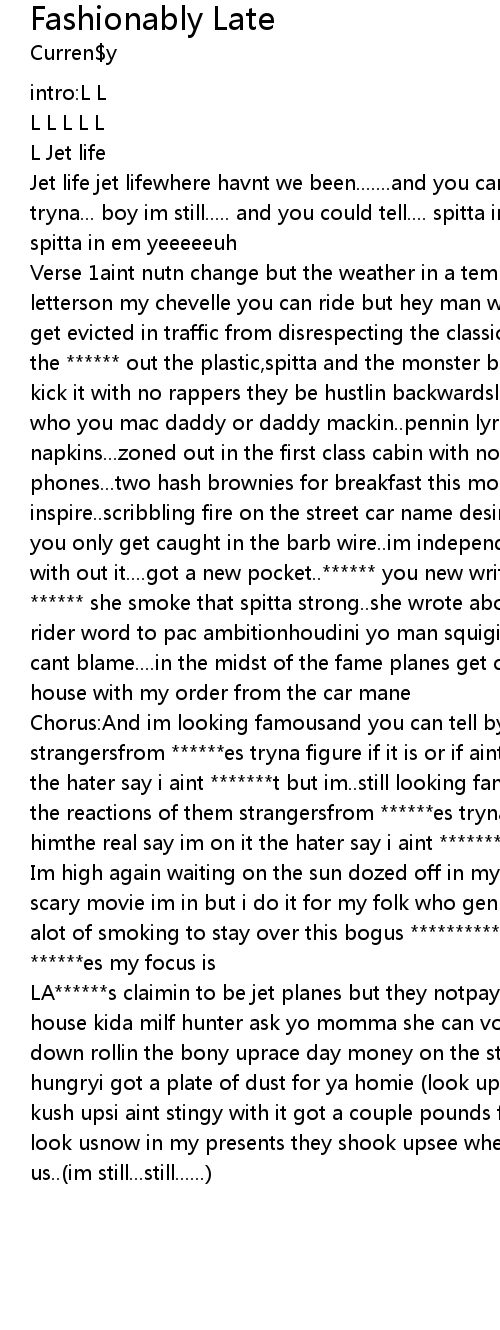 Jet life jet lifewhere havnt we been.......and you can tell...from ******es tryna... boy im still..... and you could tell.... spitta in em spitta in em spitta in em yeeeeeuh |