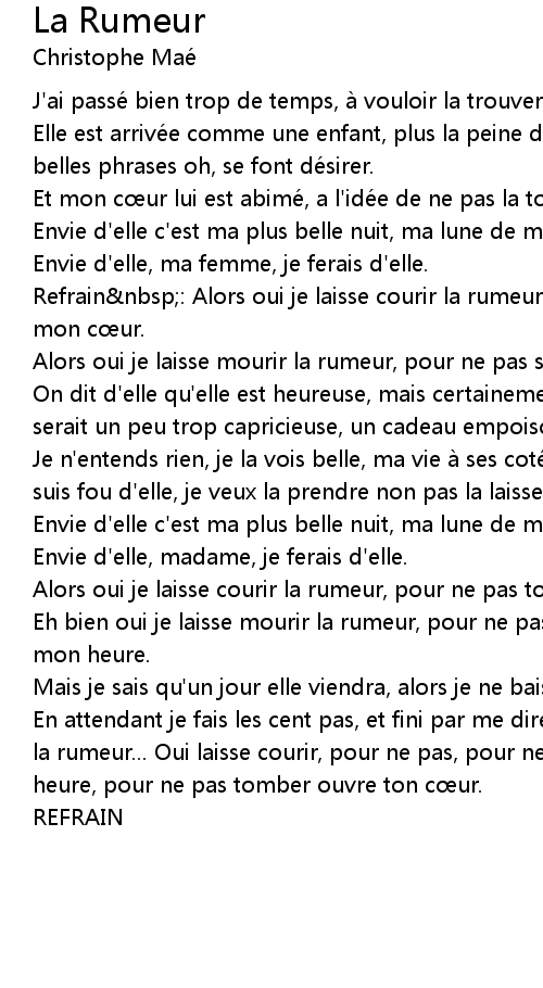 | Refrain nbsp: Alors oui je laisse courir la rumeur, pour ne pas tomber j' ouvre mon c ur. | |