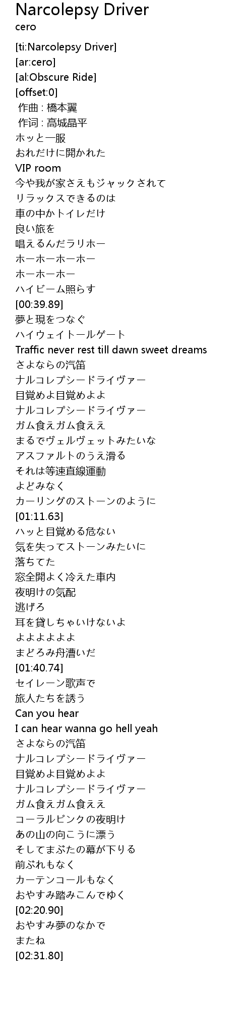 | [01:56.77] | ナルコレプシードライヴァー |