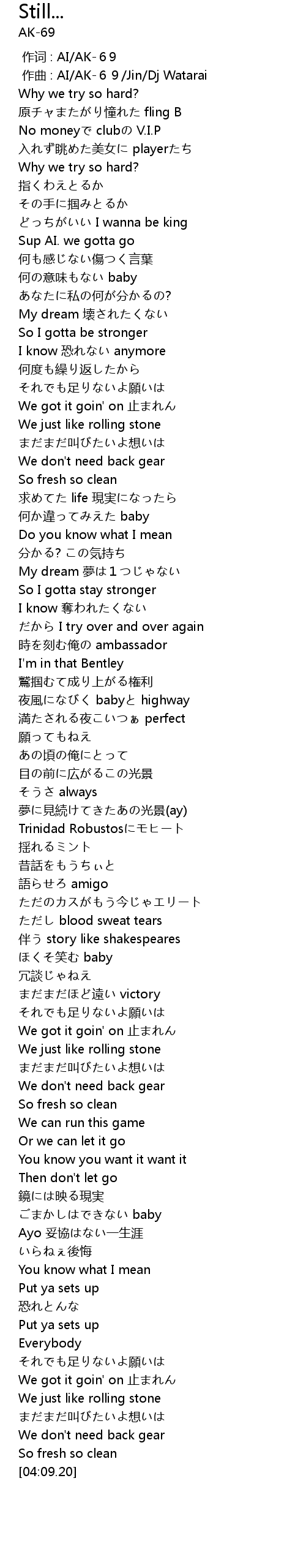| [00:01.000] | 作曲 : AI/AK-69/Jin/Dj Watarai |