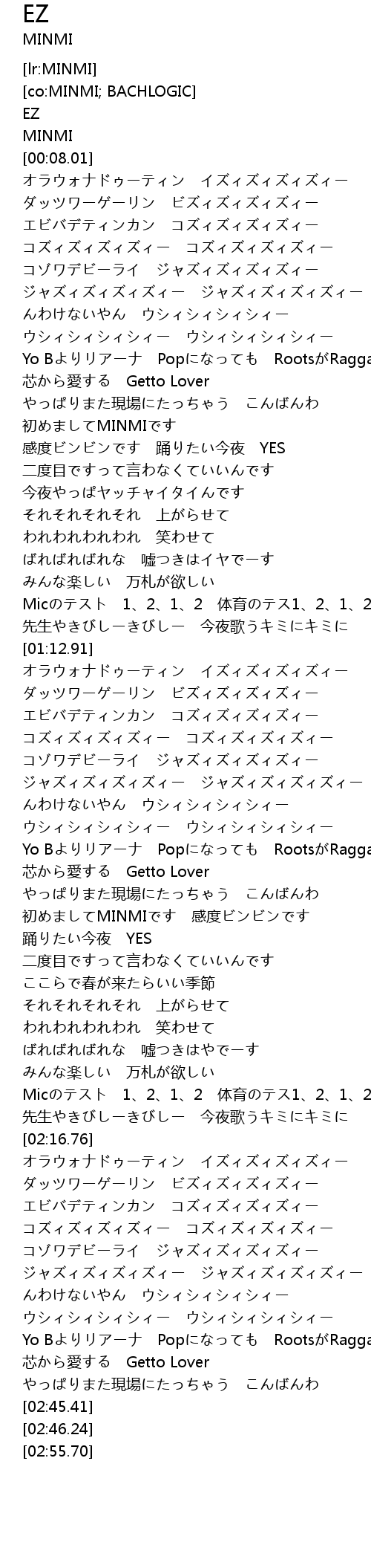 | [01:40.67] | 初めましてMINMIです 感度ビンビンです |