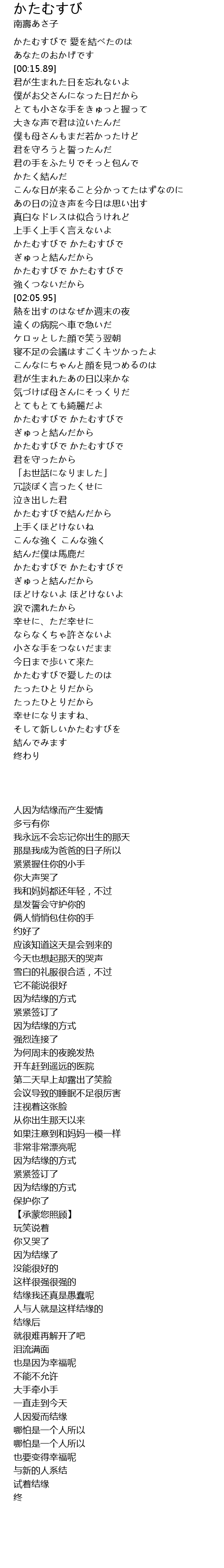 | [00:00.00] | かたむすびで 愛を結べたのは |