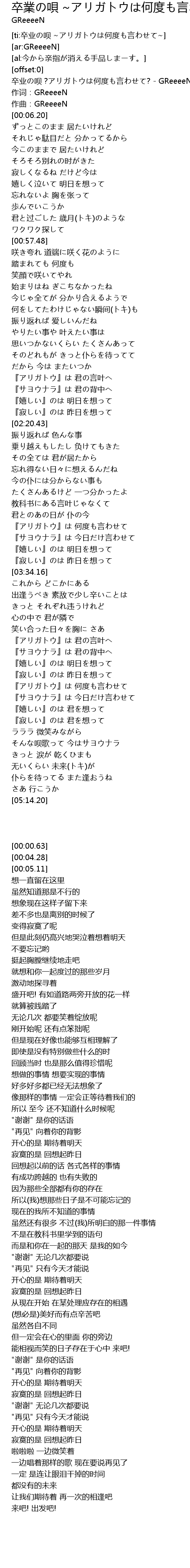 | [00:00.63] | 卒业の呗 ?アリガトウは何度も言わせて? - GReeeeN |