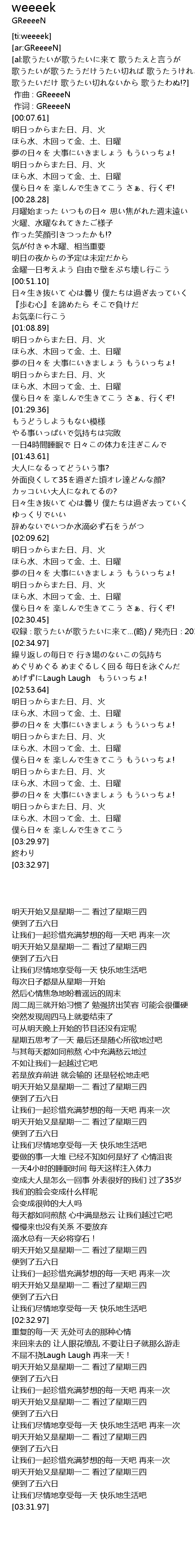 | [03:20.51] | 明日っからまた日、月、火 ほら水、木回って金、土、日曜 |