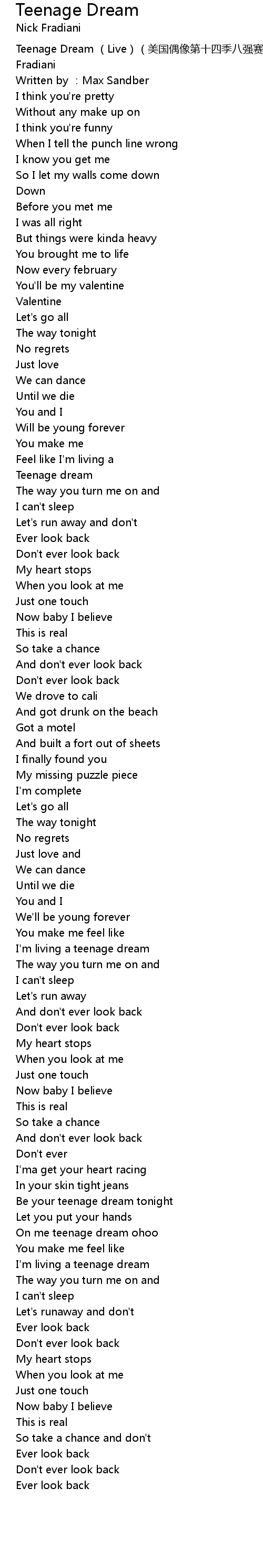 | [00:00.414] | Teenage Dream Live mei guo ou xiang di shi si ji ba qiang sai Nick Fradiani |