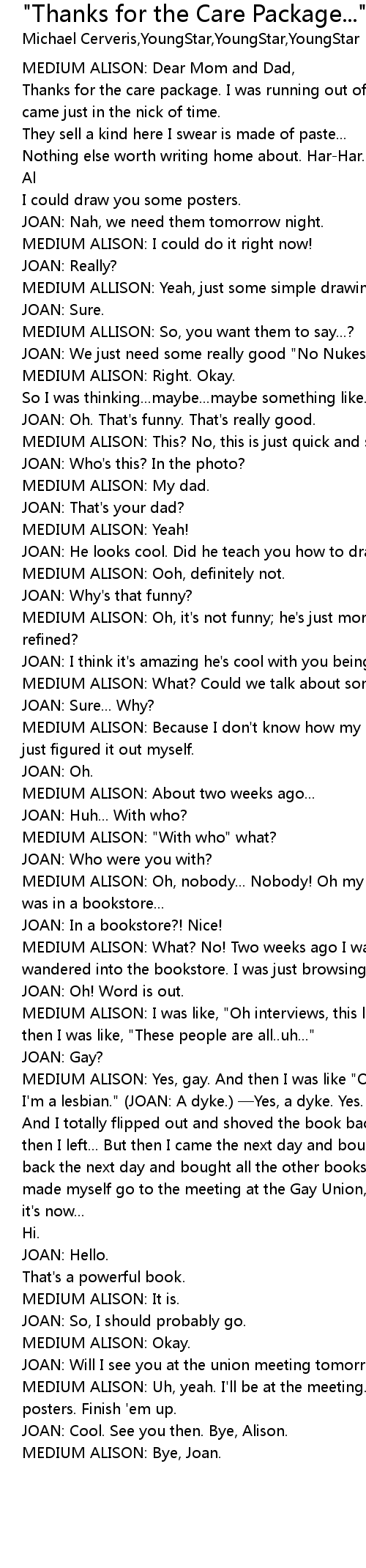 | [00:02.538] | MEDIUM ALISON: Dear Mom and Dad, |