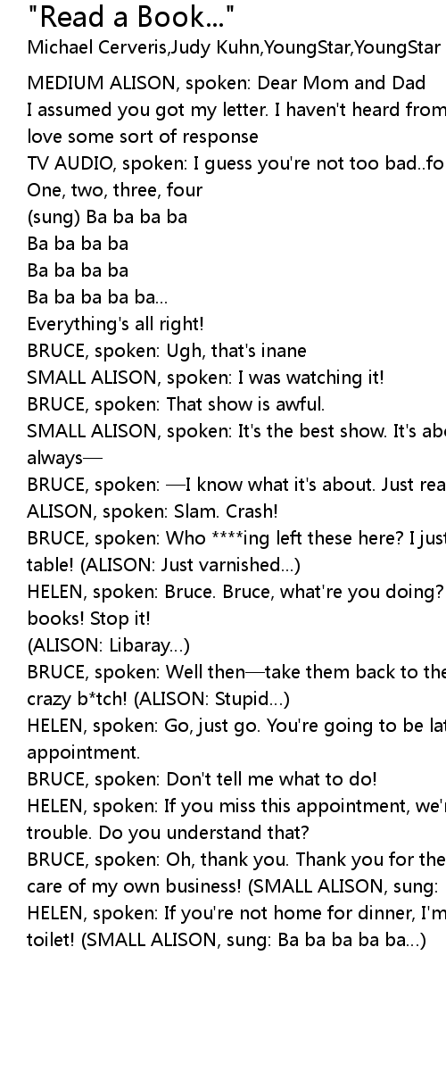 | [00:58.365] | HELEN, spoken: If you're not home for dinner, I'm throwing it in the toilet! (SMALL ALISON, sung: Ba ba ba ba ba…) |
