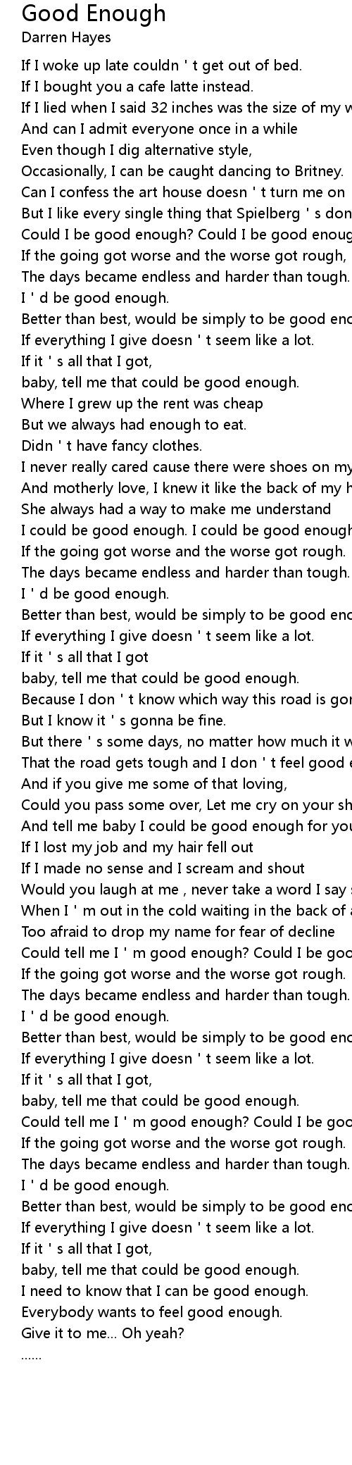 | [03:53.850] | Could tell me I m good enough? Could I be good enough? |