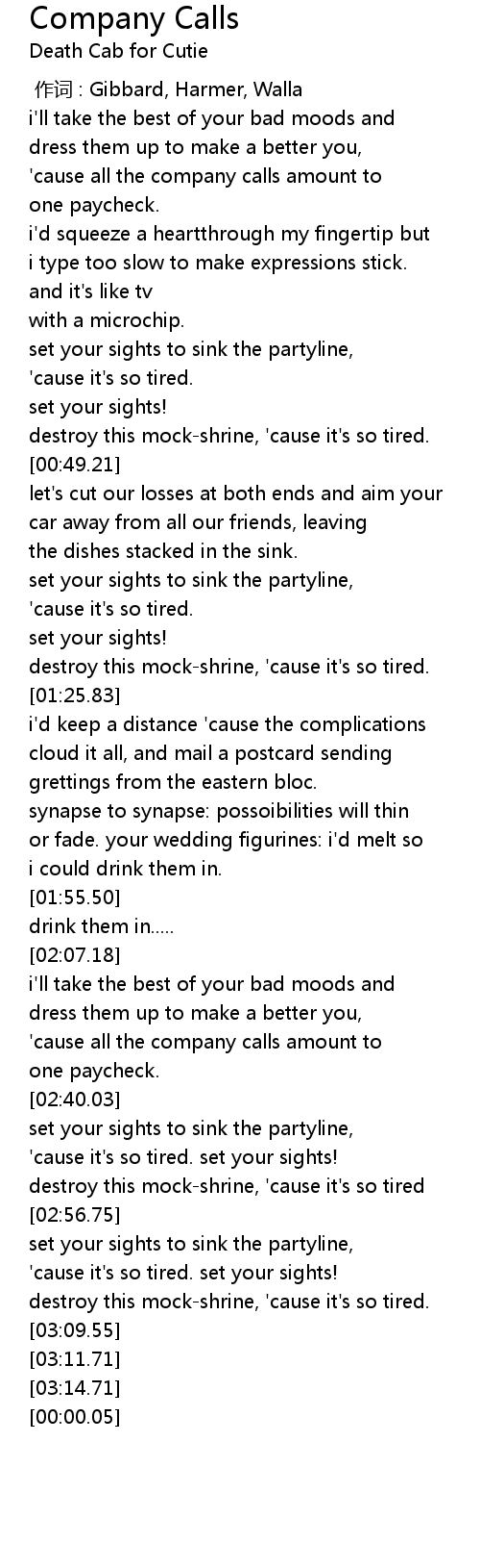 | [00:00.00] | zuò cí : Gibbard, Harmer, Walla |