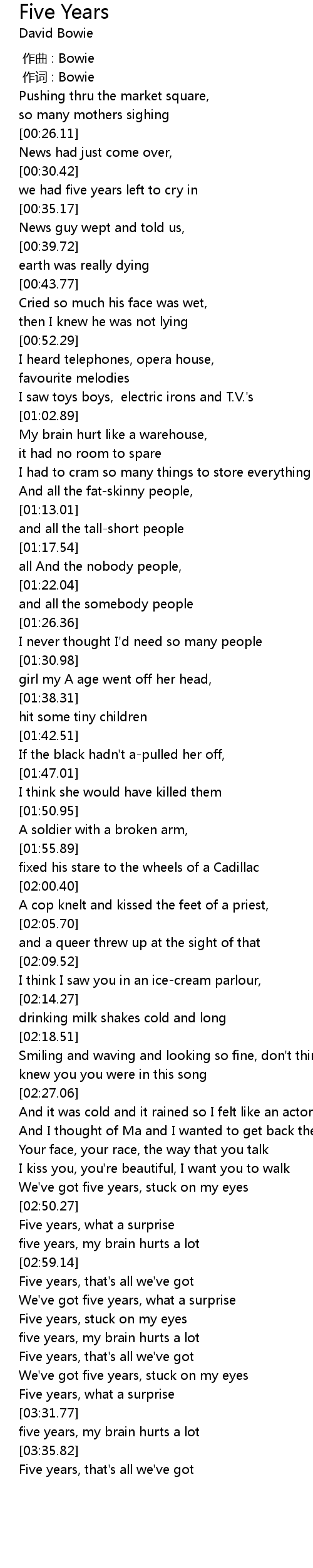 | [03:00.39] | Five years, that's all we've got |
