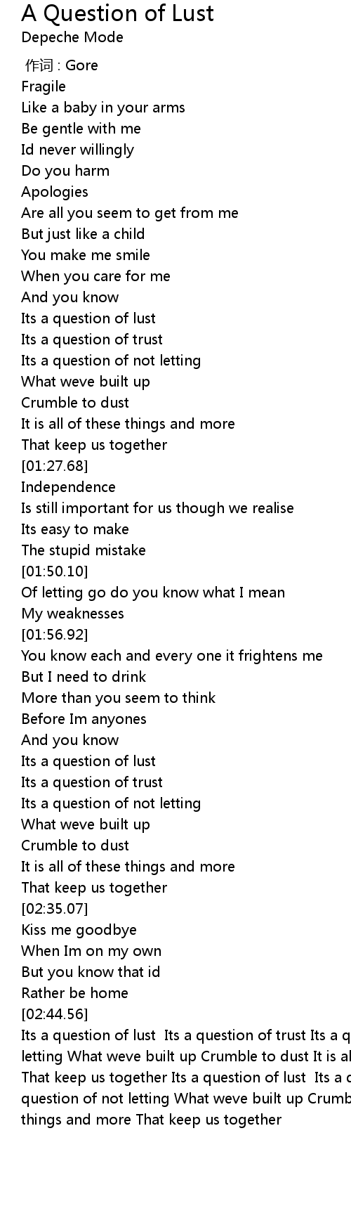 | [02:45.12] | Its a question of lust Its a question of trust Its a question of not letting What weve built up Crumble to dust It is all of these things and more That keep us together Its a question of lust Its a question of trust Its a question of not letting What weve built up Crumble to dust It is all of these things and more That keep us together |