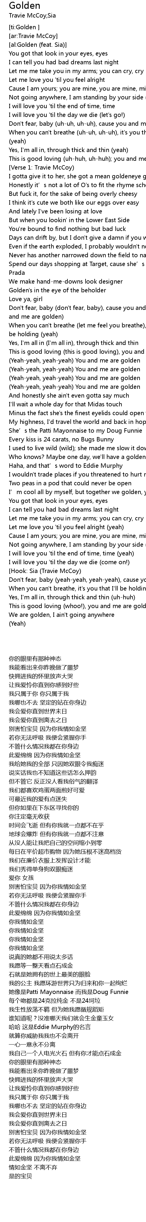 | [02:56.030] | Don' t fear, baby yeahyeah, yeahyeah, cause you and me are golden |
