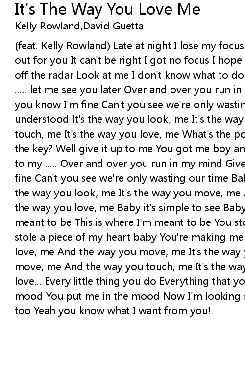 (feat. Kelly Rowland) Late at night I lose my focus Late at night I'm calling out for you It can't be right I got no focus I hope you noticed The chemistry is off the radar Look at me I don't know what to do This chemistry is off the radar ..... let me see you later Over and over you run in my mind Give me one look and you know I'm fine Can't you see we're only wasting our time Baby thought you understood It's the way you look, me It's the way you move, me And the way you touch, me It's the way you love, me What's the point? I can't remember Where's the key? Well give it up to me You got me boy and I surrender Lets get you back to my ..... Over and over you run in my mind Give me one look and you know I'm fine Can't you see we're only wasting our time Baby thought you understood It's the way you look, me It's the way you move, me And the way you touch, me It's the way you love, me Baby it's simple to see Baby it's simple This is where I'm meant to be This is where I'm meant to be You stole a piece of my heart You stole a piece of my heart baby You're making me start all over It's the way you love, me And the way you move, me It's the way you love, me And the way you move, me And the way you touch, me It's the way you love, me And the way you love... Every little thing you do Everything that you do You can put me in the mood You put me in the mood Now I'm looking straight at you You're looking at me too Yeah you know what I want from you! |