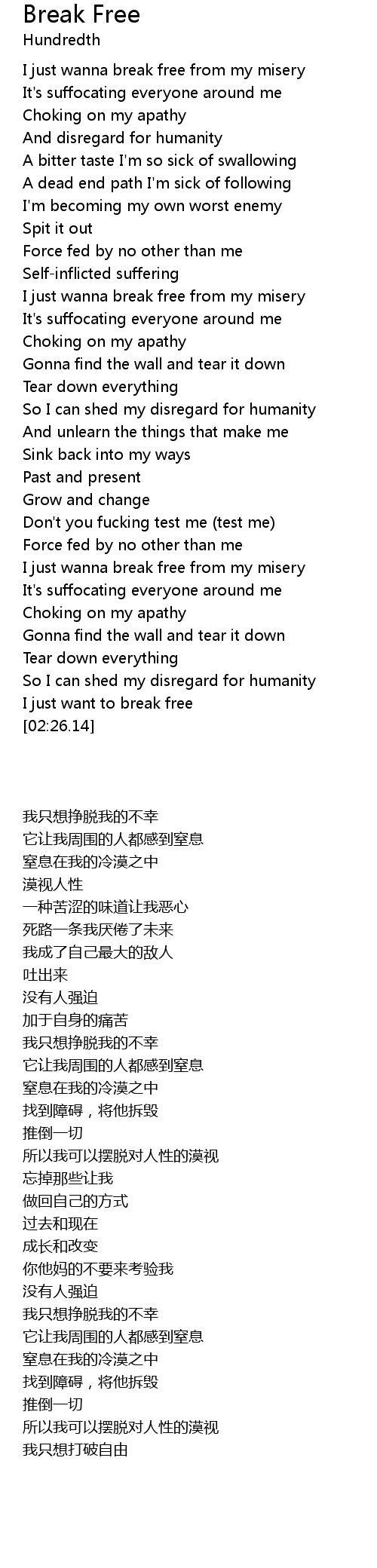 | [00:49.68] | I just wanna break free from my misery |