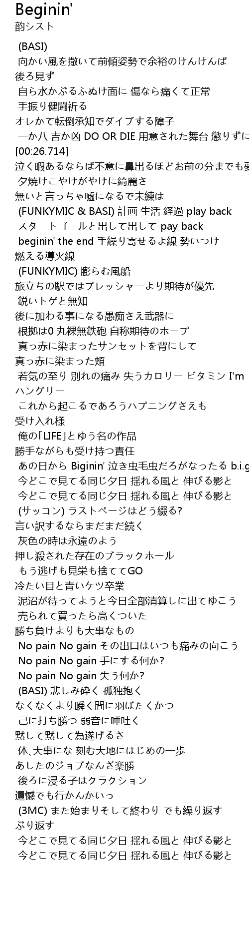 | [02:28.885] | (3MC) また始まりそして終わり でも繰り返す ぶり返す |