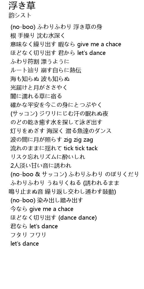 | [00:05.439] | (no-boo) ふわりふわり 浮き草の身 |