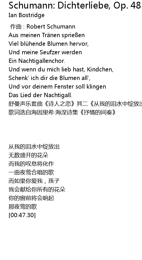 | [00:47.30] | 舒曼声乐套曲《诗人之恋》其二《从我的泪水中绽放出》 |