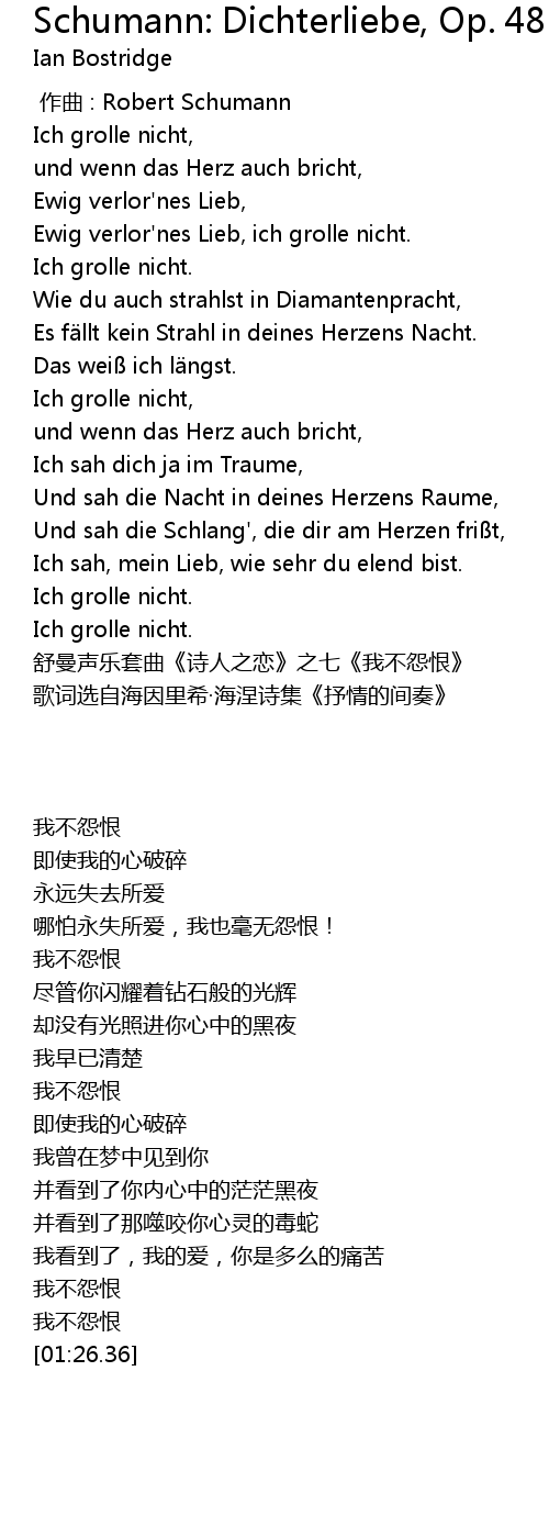 | [01:26.36] | 舒曼声乐套曲《诗人之恋》之七《我不怨恨》 |