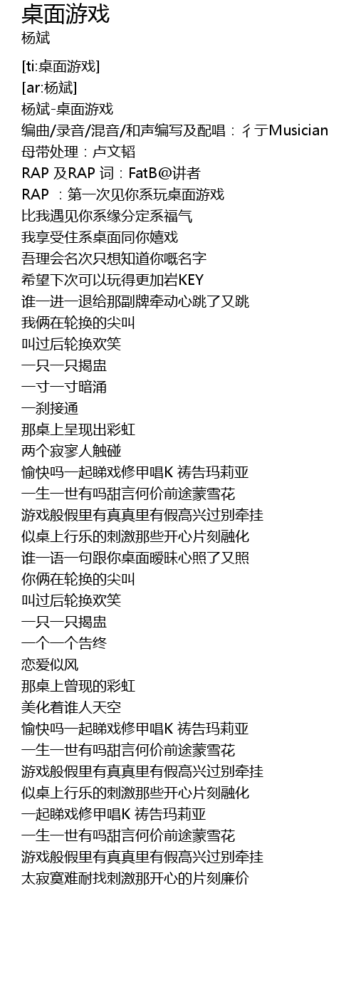 | [00:13.384] | RAP : dì yī cì jiàn nǐ xì wán zhuō miàn yóu xì |