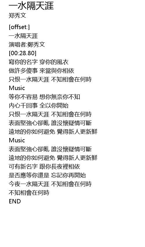 | [00:00.80] | 一水隔天涯 |