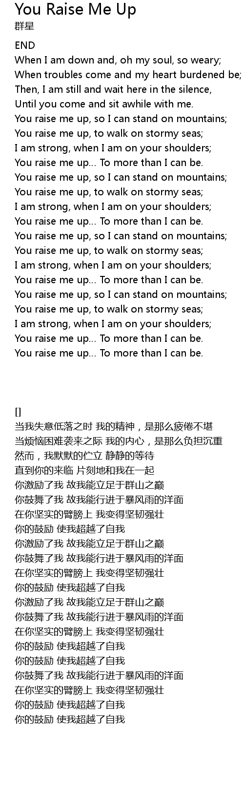| [01:55.490] | You raise me up To more than I can be. |