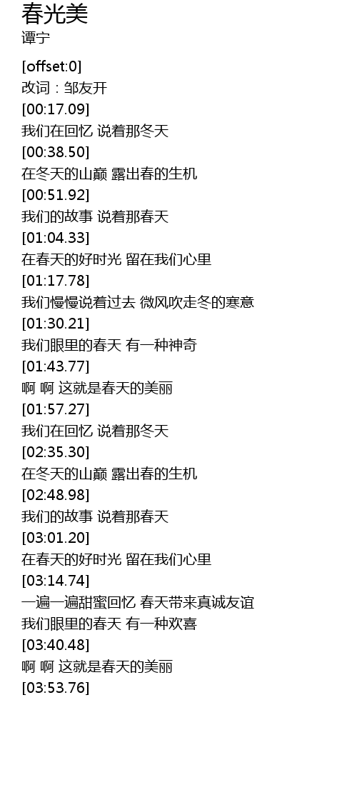 | [03:15.85] | 一遍一遍甜蜜回忆 春天带来真诚友谊 |