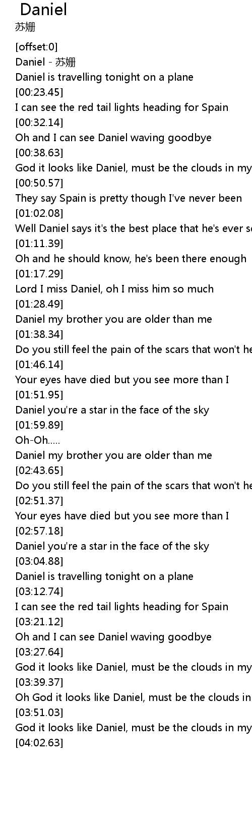 | [00:42.05] | God it looks like Daniel, must be the clouds in my eyes |