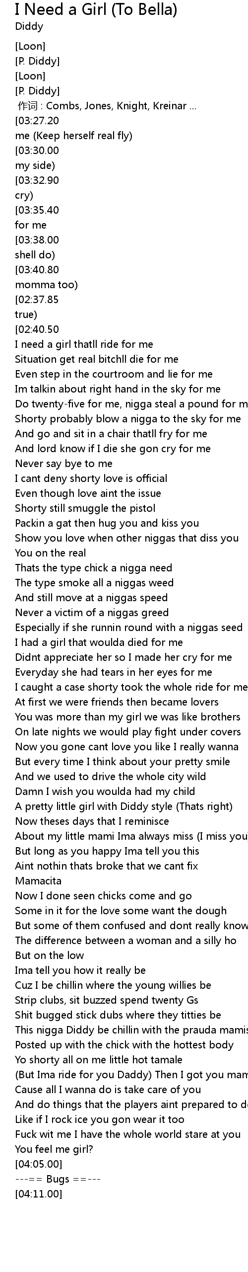 | [03:49.10][03:27.20][02:21.80][01:15.90][00:09.80] | I need a girl wholl ride for me (Keep herself real fly) |