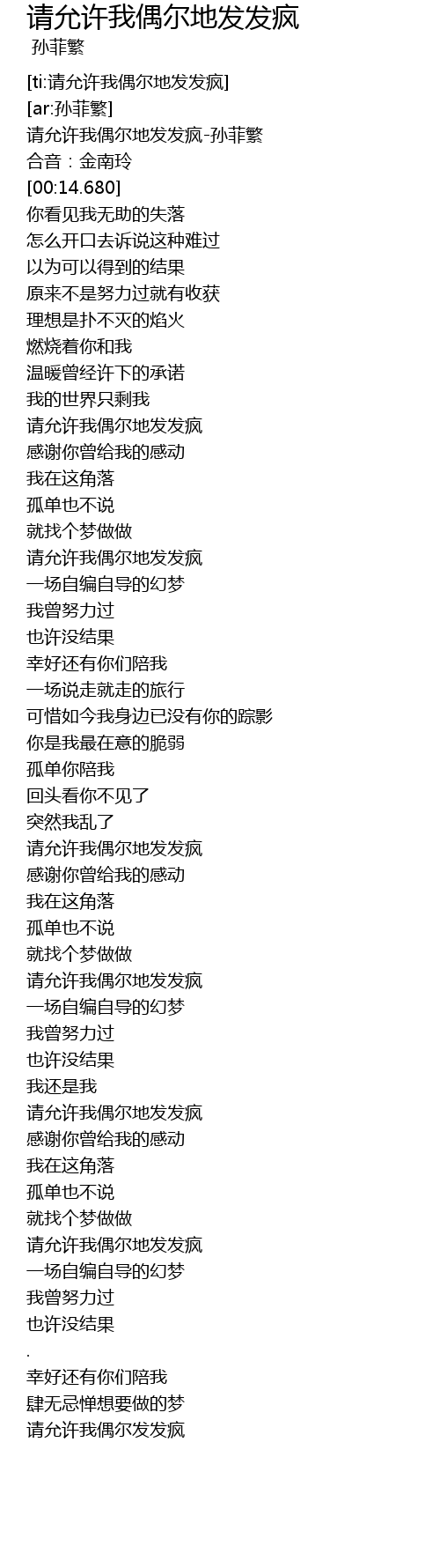 | [00:00.712] | 请允许我偶尔地发发疯-孙菲繁 |