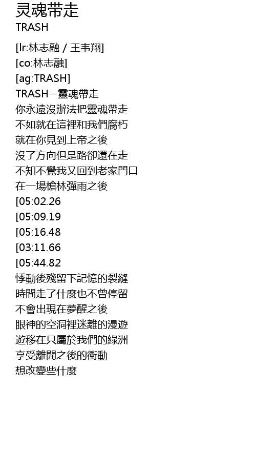 | [00:00.00] | TRASH líng hún dài zǒu |