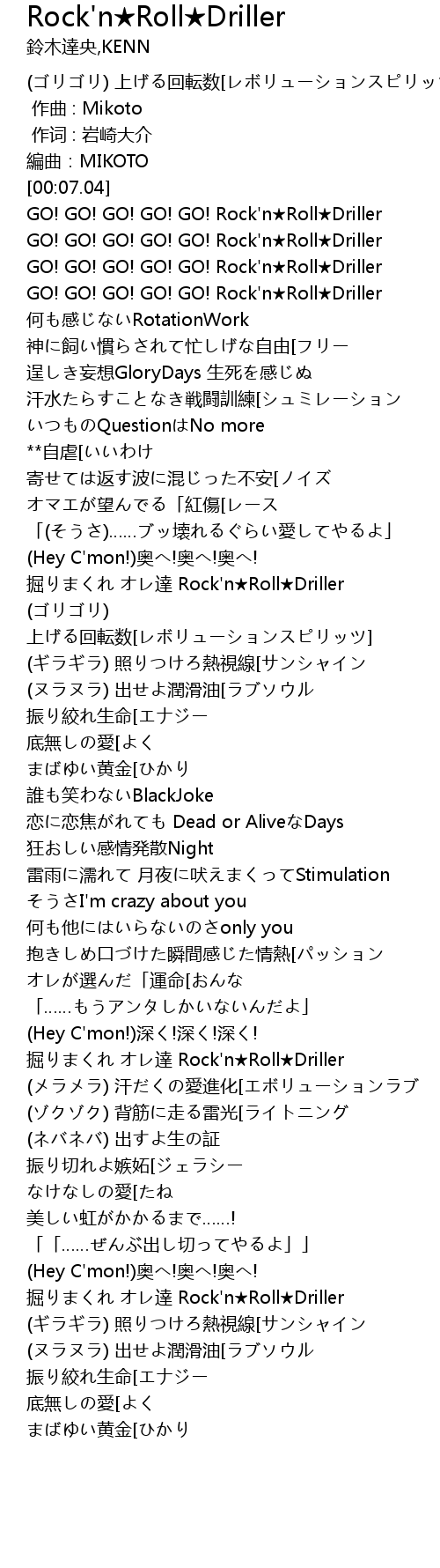 | [00:27.40] | GO! GO! GO! GO! GO! Rock'n★Roll★Driller |