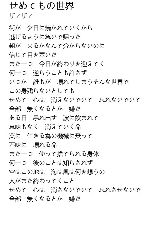 | [00:59.21] | いつか 誰もが 壊れてしまうそんな世界で |