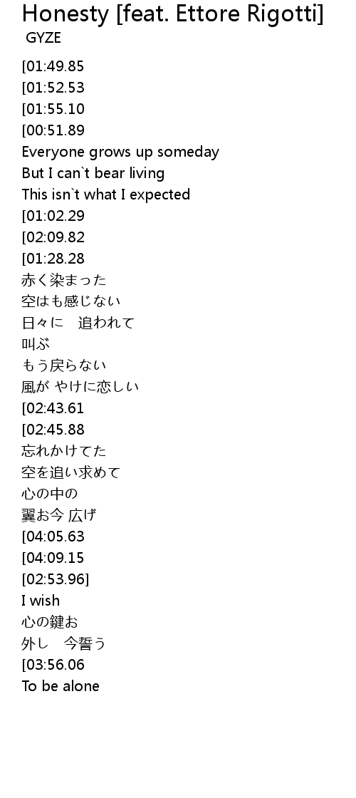 | [01:07.66][01:28.28][01:43.24][02:12.49][02:33.10][02:48.11][04:03.92][04:18.87] | Honesty |