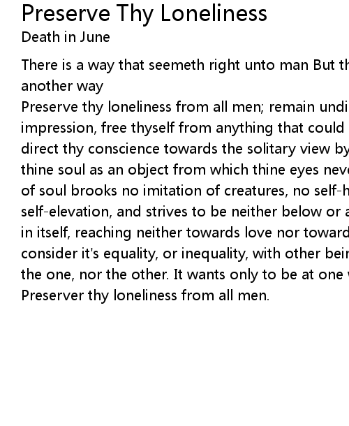 Preserve thy loneliness from all men; remain undisturbed by all except the impression, free thyself from anything that could be foreign to thy being, and direct thy conscience towards the solitary view by which thou bearest a beast in thine soul as an object from which thine eyes never wander. Complete isolation of soul brooks no imitation of creatures, no self-humiliation, nor self-elevation, and strives to be neither below or above, wanting only to rest in itself, reaching neither towards love nor towards suffering. It does not consider it's equality, or inequality, with other beings. It wants neither to be the one, nor the other. It wants only to be at one with itself. |