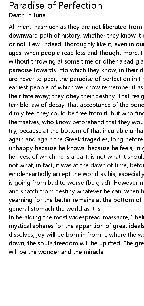 All men, inasmuch as they are not liberated from the bondage of time, follow the downward path of history, whether they know it or not and whether they like it or not. Few, indeed, thoroughly like it, even in our epoch, let alone in happier ages, when people read less and thought more. Few follow it unhesitatingly, without throwing at some time or other a sad glance towards the distant lost paradise towards into which they know, in their deeper consciousness, that they are never to peer; the paradise of perfection in time within so remote that the earliest people of which we know remember it as only a dream. Yet they follow their fate away; they obey their destiny. That resigned submission to the terrible law of decay; that acceptance of the bondage of time by creatures who dimly feel they could be free from it, but who find it too hard to try to free themselves, who know beforehand that they would never succeed, even if they did try, because at the bottom of that incurable unhappiness of man the deplored again and again the Greek tragedies, long before these were written. Man is unhappy because he knows, because he feels, in general, that the world in which he lives, of which he is a part, is not what it should be; not what is could be; not what, in fact, it was at the dawn of time, before decay set in. He cannot wholeheartedly accept the world as his, especially not accept the fact that it is going from bad to worse (be glad). However much he may try to be a realist, and snatch from destiny whatever he can, when he can, still an invincible yearning for the better remains at the bottom of his heart; he cannot, in general stomach the world as it is. |