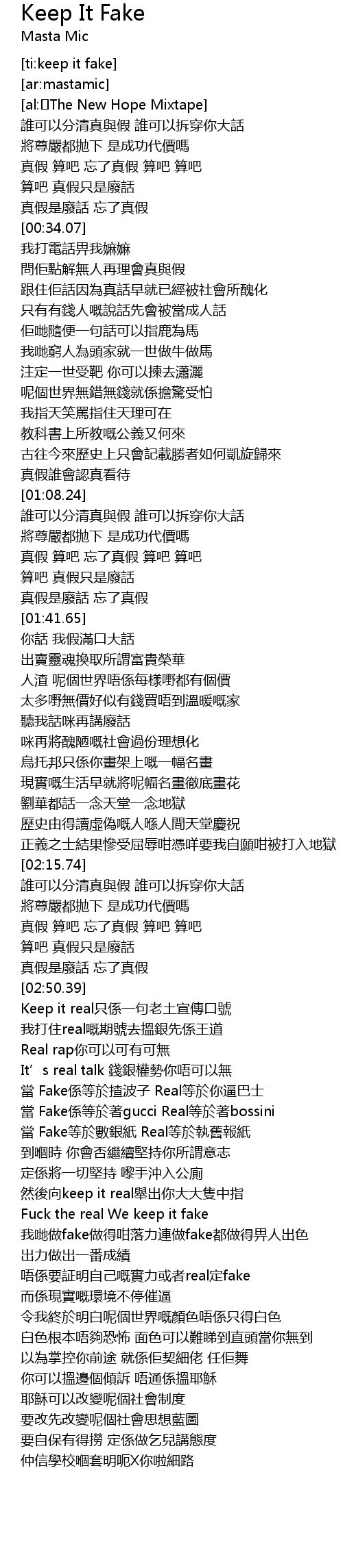 | [03:20.26] | 我哋做fake做得咁落力連做fake都做得畀人出色 |