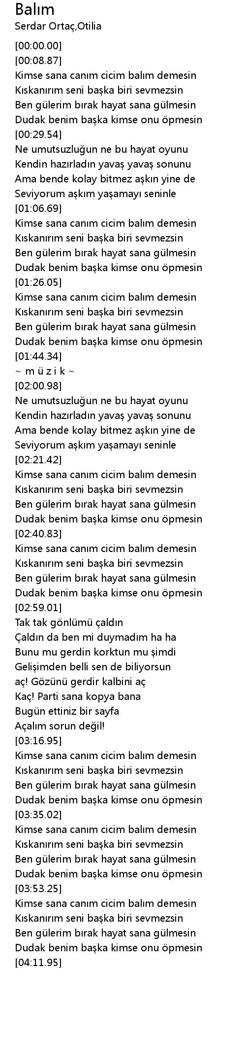 | [02:40.93] | Kimse sana can m cicim bal m demesin |