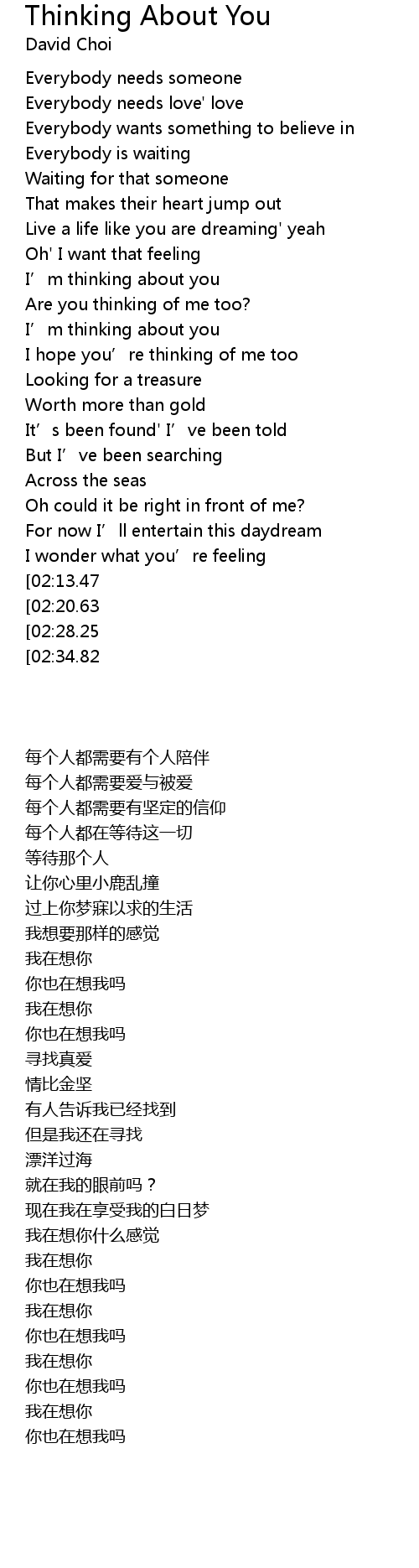 | [02:57.83][02:13.47] | I' m thinking about you |
