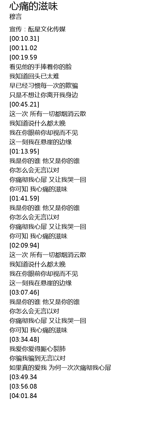 | [04:09.84][03:56.08] | 你可知 我心痛的滋味 |